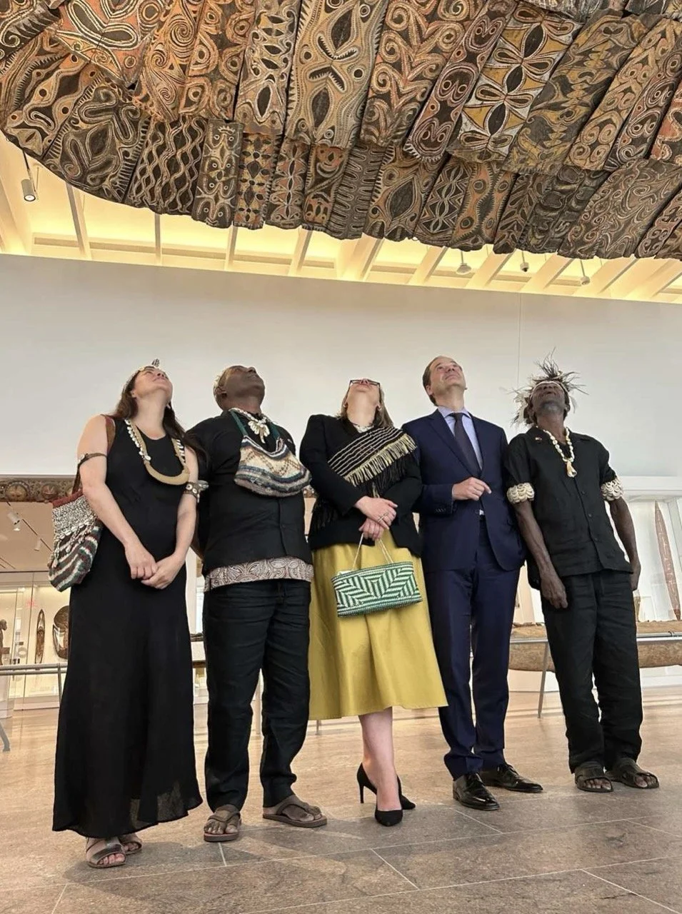 Shiva Lynn Burgos, Tobi Borungai, The Met curator Dr. Maia Nuku, The Met Director Max Hollein, and Chief Mathew Kuarchinj looking up at the Ceremonial Ceiling